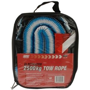 This Maypole tow rope has a maximum capacity of 2500kg - suitable for average sized cars in the UK (check with the manufacturer to ensure the car weighs 2500kg or less). It has heavy duty forged hooks with safety catches to ensure a secure attachment to the vehicle and being elasticated, the rope reduces snatch and absorbs slack when towing. The length of the rope is 1.75m minimum to 4m maximum stretched and comes with a warning flag, an 'ON TOW' sign, full instructions and a handy storage bag. The rope is also TUV/ GS approved.